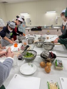 料理づくりでは肉や野菜など食材のこと、また包丁やまな板、調理器具の使い方、味付けのテクニック等々をわかりやすく、料理になれていないお子さんでもできるように学びます。
