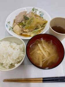 メニューは、すき焼き風煮とタケノコの味噌汁、フルーツゼリー
